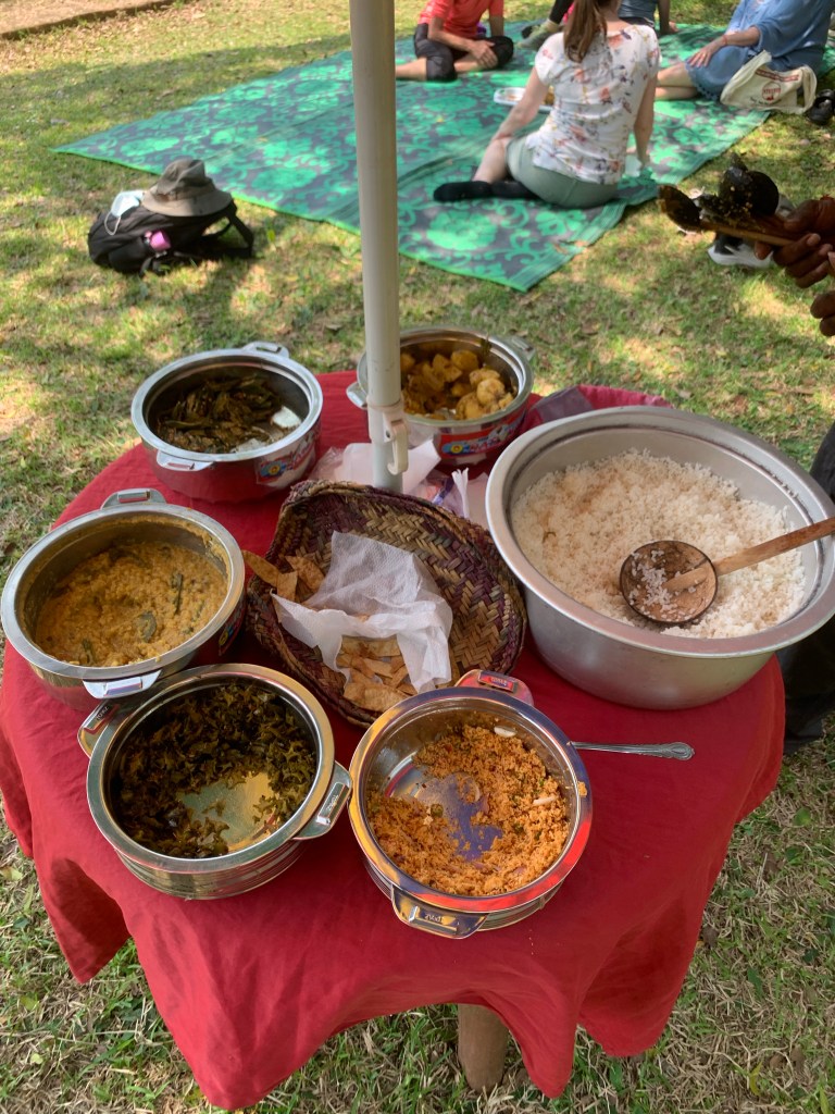 Further cycle to our lunch stop. Our guide has arranged for a couple of tuktuks to meet us by the Elephant Pool with picnic blanket and a spread of rice, potato curry, spiced okra, and other little pots full of taste.